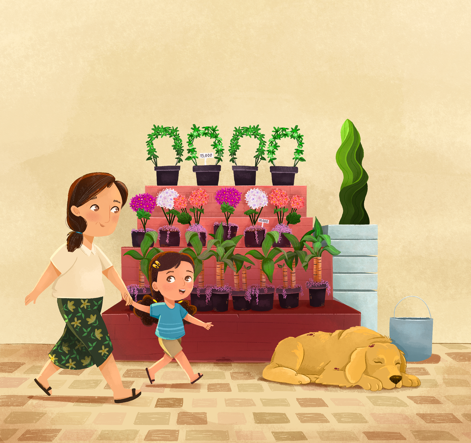 Esta ilustración nace de los paseos diarios en familia, donde descubro lo especial de lo cotidiano: los colores, las plantas, los pequeños detalles que hacen único a mi barrio. Es un homenaje a esos momentos simples que se vuelven memorias.